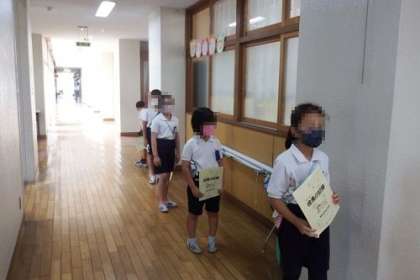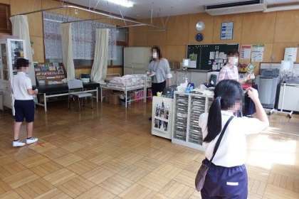 今日は、3年生の身体測定を行いました。今は、新型コロナウイルス感染予防のために、視力検査を行う保健室の入室も5人に制限し、廊下で待っているときは、距離をとるように並んでいます。