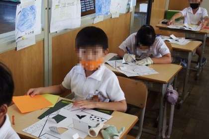 「カッターナイフと友だちになろう」をめあてに、図工で「まどからこんにちは」に取り組みました。まどをカッターで切り抜いた後は、自分の好きな色紙をつかって、まどに貼り付けます。きれいな、きれいな家ができ上ります。