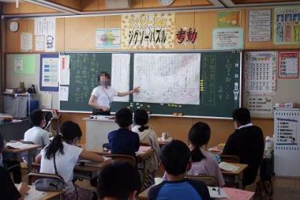 川崎洋さんがつくった詩「いま始まる新しいいま」の授業の様子です。四連でつくられたこの詩で、作者が訴えたかったのは何か、みんなで読み込みを深めていきます。