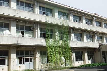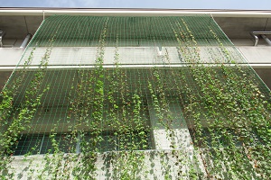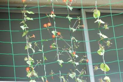 ツルレイシによる「緑のカーテン」がぐんぐん成長し、現在は、3階の教室にかかるくらいまで伸びてきました。ひと夏を越えて、大きく成長しました。かわいい赤い花びらも咲いています。
