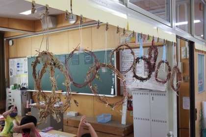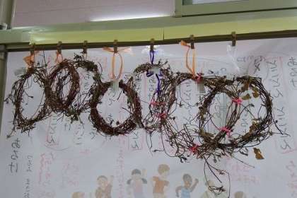 1年生の教室の廊下側の窓に、家から持ってきたリースが飾られ始めました。水分を抜いていく予定です。これから12月に向けて飾りを付けていく予定です。世界に一つしかない自分だけのリース。完成が楽しみです。