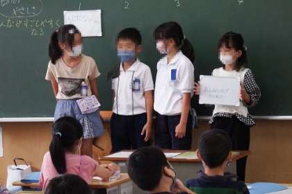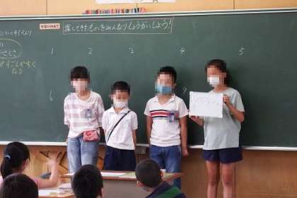 「学校にある人にやさしいものは?」3年生が総合的な学習「やさしさ たんけん」で学校のやさしさ探しを行いました。今日は、グループでの発表です。子どもたちの視点でたくさんのやさしさを見つけることができました。これからもっともっと見つけれるといいな。