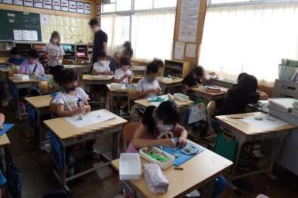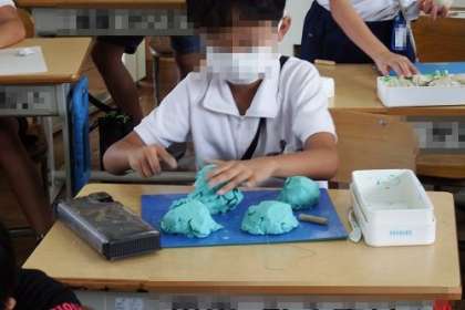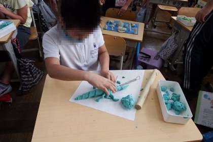 ねん土の時間は大好き。今日は、手だけではなく、道具を使って作品を作ります。のばしぼうやかきべら、糸きろ、ねんどべらなど、道具の特徴を生かしながら、自分が作りたい作品を仕上げていました。