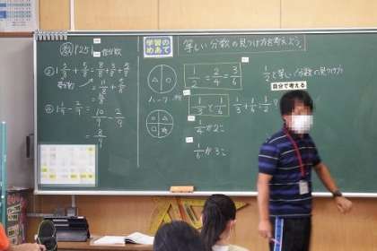 1/2=2/4=3/6のように、「等しい分数の見つけ方」を考えました。分子と分母の関係に着目し、同じ数をかければ等しい分数になることに気づいていきました。