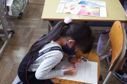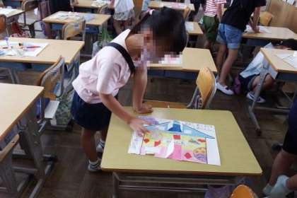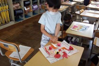 図工で取り組んできた「まどからこんにちは」の作品が完成したので、みんなでお互いの作品を鑑賞しました。友達の作品の窓を実際に手で空けて、作品にほどこされた工夫を楽しんでいました。