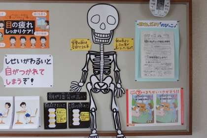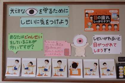 保健室横のコーナーに、「大切な目を守るために、しせいに気をつけよう」の掲示がされています。これから読書に季節にもなります。正しい姿勢で学習や読書に取り組んでほしいです。自分の健康(体)を自分で守れるように。
