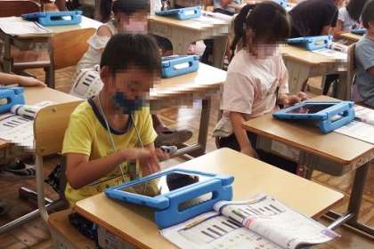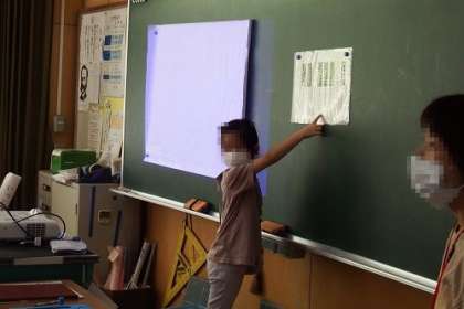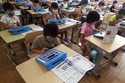 音楽で「どんぐりさんのおうち」を学習しました。鍵盤ハーモニカの代わりにタブレットを使って、ドとソの位置を確認し、指の動かし方を練習しました。黒鍵の2つのお山と3つのお山を目印に。