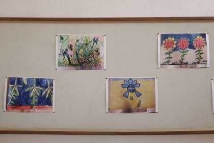 図工で取り組んできた「まぼろしの花」の作品を紹介します。4年1組と2組の作品です。
