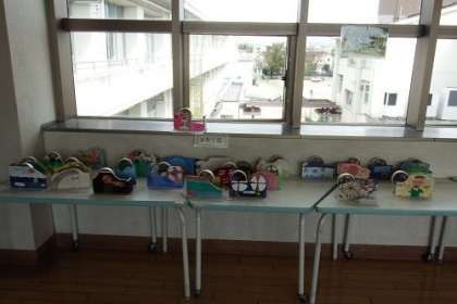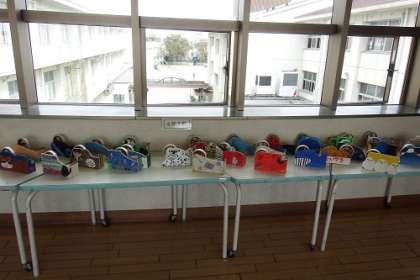 6年生が図工で取り組んできた「テープカッター」が完成しました。現在3階のわたりに展示してあります。写真は、6年1組と2組です。