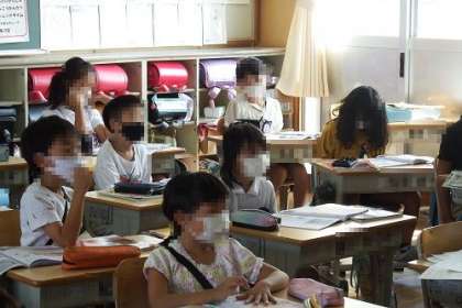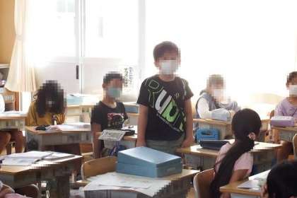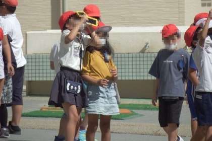 理科で「地面のようすと太陽」の単元を学習しています。かげは、太陽に対してどのようにできるのか。教室で話し合いました。外に出て、普段直接は見ることができない太陽を、しゃ光板を使ってみることができました。