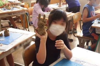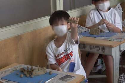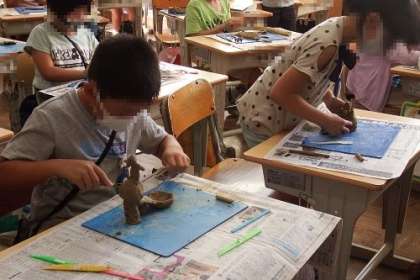図工の時間に、初めての土ねんどの作品作りを進めています。土ねんどを触った時の感触を楽しみながら、自分の作品作りに集中しています。できた作品はわたりに展示してります。学校公開でご来校の折に、見ていってください。