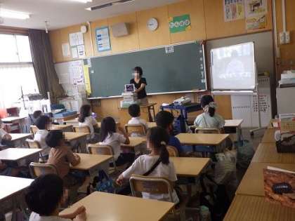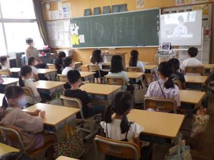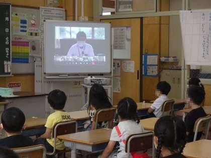 新型コロナウイルス感染症の予防対策として、10月12日に後期の始業式を各教室を結ぶオンラインで行いました。体育館で実施していた時と同じように、姿勢を正しながらスクリーンに集中してお話を聞くことができていました。