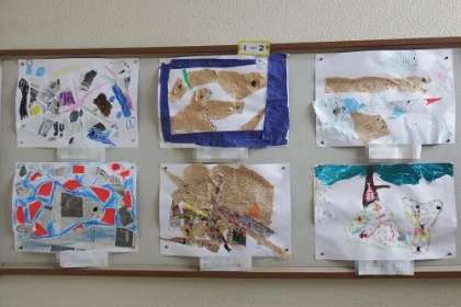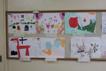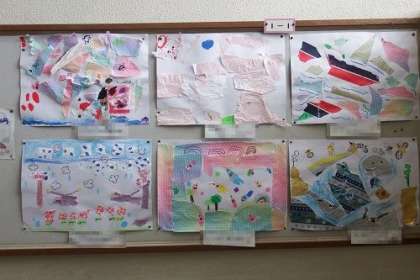 1年生が図工で取り組んだ「やぶいたかたちから うまれたよ」の作品を学年掲示板に掲示しています。来週の参観の折に、ご覧ください。写真は、1年1組、2組、3組の作品です。