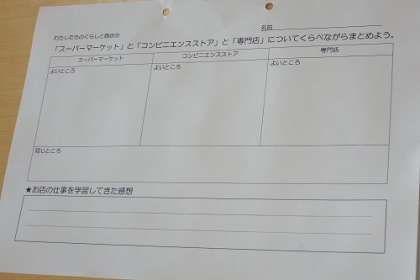 社会科の商店の学習で、スーパーマーケットとコンビニエンスストア、専門店を比べる学習を始めました。まずは、各自で自分の考えをプリントにまとめます。これからの話し合いが楽しみです。