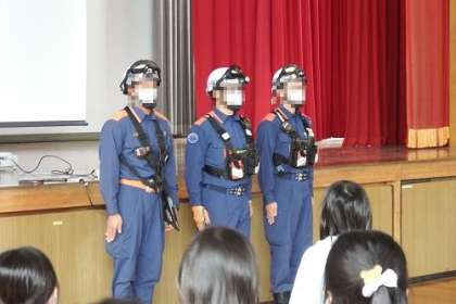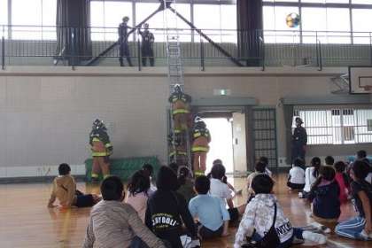 体育館にもどり、火事が起きた想定で、実際に119番に電話しました。電話で応対した消防署の方から、その場で動画の撮影を指示され、現場の状況を確実に伝える訓練を行いました。実際に、逃げ遅れた人の救助訓練を見ることができました。子どもたちから、実際に起きた時に役立ちそうという言葉がたくさん聞かれました。消防署の皆様、ありがとうございました。