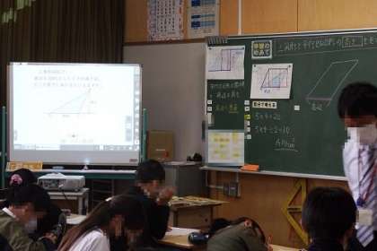 算数の学習で「平行四辺形の高さ」について考えました。平行四辺形のどこを高さとするのか、公式の意味にもふれながら、みんなで学習に取り組みました。