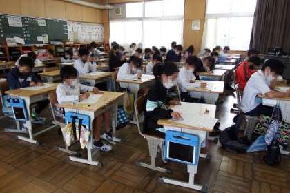 4年生が月例テストに取り組みました。取り組んできた学習内容の定着をはかるのが目的です。頑張ってきた成果を発揮しようと、みんな集中してテスト問題の向かっていました。