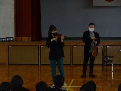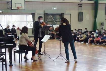 美山音楽会を開催しました。一昨年度までは全校で鑑賞していましたが、コロナ禍となってしまったため、学年をしぼり6年生を対象に実施しました。子どもたちは、バイオリン、ヴィオラ、チェロ、ピアノ、本物の楽器が奏でるハーモニーに聴き入っていました。