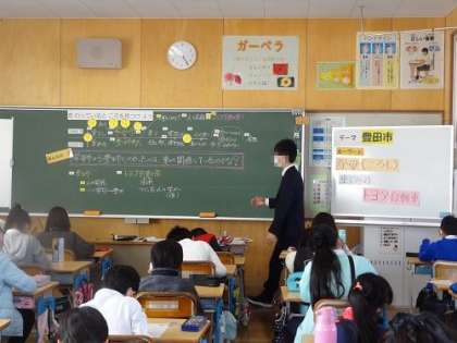 4年3組で研究授業を実施しました。社会科「きょう土の伝統・文化と先人たち」の学習です。昔と今の豊田市の写真を比較しその違いを話し合うことで、これからの学習課題を自分たちでつくる授業でした。子どもたちの積極的な発言がたくさん見られました。