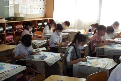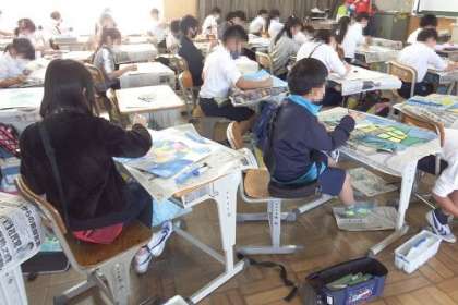 図工で取り組んでいる感想画「にじいろのさかな」。今日は、背景の色塗りを行いました。にじいろの魚にぴったりの背景が、たくさんできあがりました。静かに集中して取り組んでいます。
