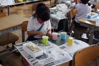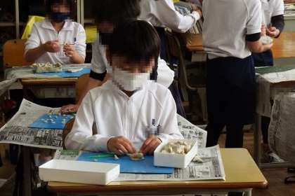 図工で、ねん土を使って「ごちそうパーティーをはじめよう」として、食べ物をを作りました。教室に入っていくと、餃子やウインナーなど、自分が作った食べ物を自慢そうに教えてくれました。とても楽しそうな時間でした。