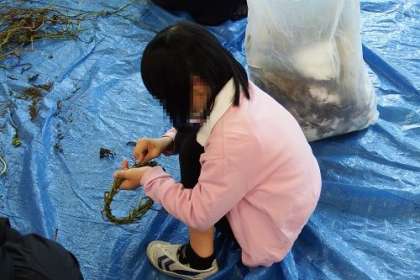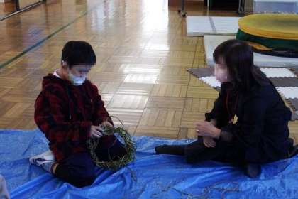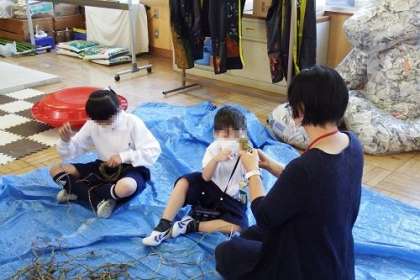 先日収穫した芋のつるを使って、リースづくりを広場で始めました。まだ、水分が残っているつるですが、子どもたちは一本一本丁寧に組み合わせていきました。