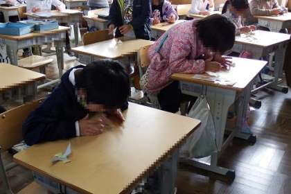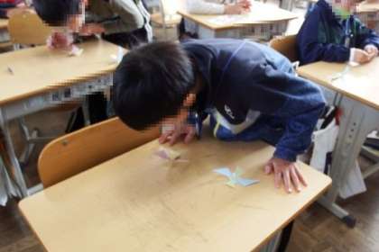 算数「円と球」の導入として、「ふきこま」を作りました。風車のような形のこまに息を吹きかけるとくるくるまわります。それが円のような形に見えます。自分のこまに一生懸命息を吹きかけ、くるくる回るこまの動きを楽しんでいました。