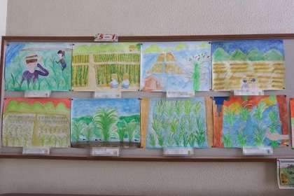 読書感想画「田んぼのいのち」が完成しました。学年掲示板に掲示してある作品を紹介します。田にぼに生きる様々な命を感じます。写真は、5年1組と2組の作品です。