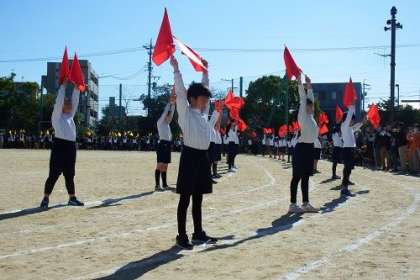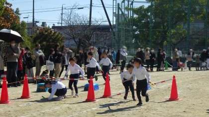 11月13日真っ青の空が広がる晴天のもと、本年度の体育発表会を行いました。この日に向けて子どもたちは多くの練習を積み重ねてきました。どの学年の発表も素晴らしく、子どもたちの笑顔や真剣なまなざしが運動場いっぱいに広がりました。多くの保護者の皆様にご参観いただきました。ありがとうございます。写真は、4年生のリレーと表現の発表の様子です。