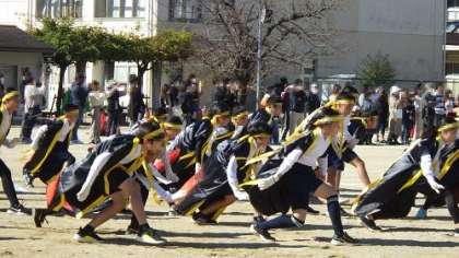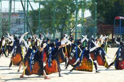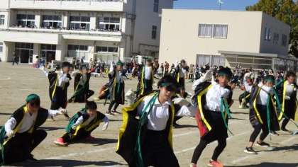 11月13日真っ青の空が広がる晴天のもと、本年度の体育発表会を行いました。写真は、6年生の表現の発表の様子です。