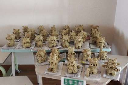 図工で焼きねんどの学習に取り組みました。作ったのはシーサーです。一人一人シーサーの表情が違います。百人いれば百通り。かわいいシーサーがいっぱいできあがりました。