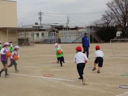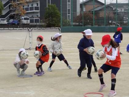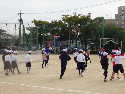 2年生がグランパスボールクリニックを行いました。名古屋グランパスから2人のコーチをお招きし、サッカーの練習やゲームを楽しみました。ボールを使って、元気いっぱい運動場を走り回る子どもたちでした。