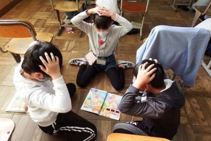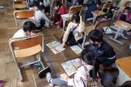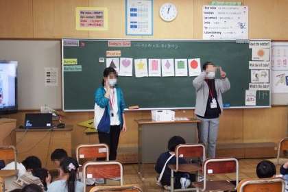 この日の課題は、「いろいろな形の言い方を知ろう」です。ハート形や星形などの英語を使って、絵の中から早く見つけるゲームを行っていました。とても盛り上がっていました。