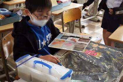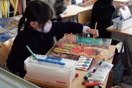 図工で取り組んでいる感想画「じごくのそうべい」が完成に近づいてきました。地獄や鬼たちの様子が、色彩豊かに表現されています。