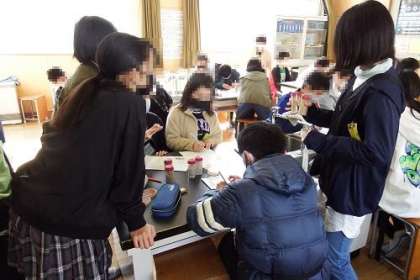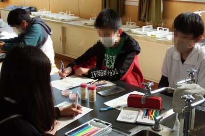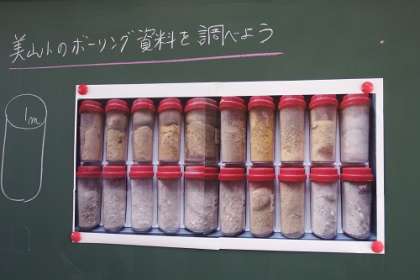 理科「土地のつくりと変化」の学習です。この日は、美山小学校の土地の様子を、昔行ったボーリング調査の標本をもとに調べていました。この美山小学校の土地のことなので、興味をもって活動できたようです。熱心に観察を行っていました。