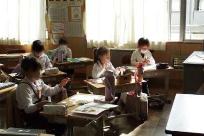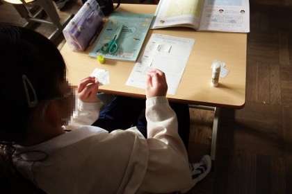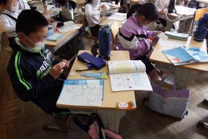算数の学習で、三角形と四角形を分ける問題に取り組みました。問題にある図形を切り抜き、三角形と四角形に分けていきます。三角形と四角形の定義をもう一度確認する時間になりました。