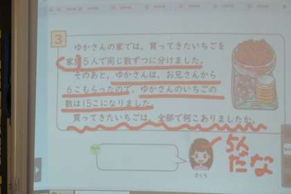 今日は算数の授業で文章題の取り組みました。問題の条件を一つずつ確認し、答えを求めるためにはどうしたらよいのか、図を使ったり、式で考えたりしながら、求めていきました。