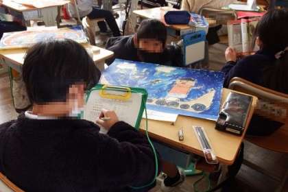 感想画「じごくのそうべい」が完成し、振り返りを記入しました。時間をかけて作った力作です。みんな満足そうでした。これからお互いの絵の鑑賞を進めます。