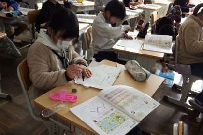 3年生の算数「円と球」で、もようづくりに取り組みました。コンパスのはりをどこにさしてかくのか、もようから円の中心を考えることが目的の一つです。コンパスで作られるもようづくりを楽しんでいました。