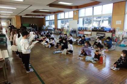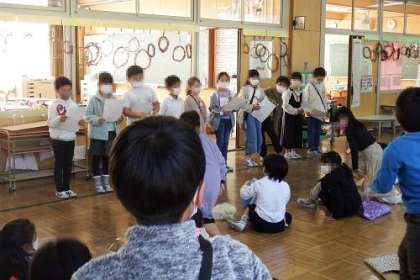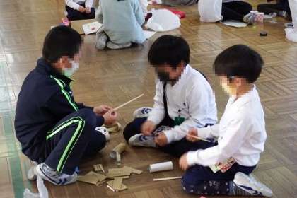 2年生が1年生を招待し、おもちゃパーティーを行いました。2年生が作ったおもちゃを紹介し、遊び方を教えてあげ、いっしょに遊びました。2年生は、1年生の子によくわかるように工夫して、優しく丁寧に教えていました。すごろくやけん玉、的当てなど2年生が考え付いた楽しいおもちゃがいっぱいでした。