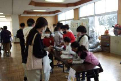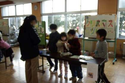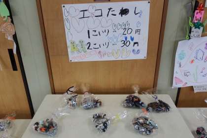 みんなで協力しながら作ってきたリースとまつぼっくりの飾り、そしてエコたわしを販売しました。素敵な作品が、ボードや机の上に並べてあります。どれを買おうか迷いました。お客さんと上手にやりとりをして、販売することができました。