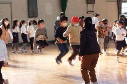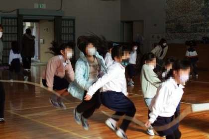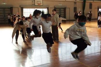 体育館に集まった子どもたちは、ボランティアのみなさんが回してくれる大繩にチャレンジ。とべた子どもたちは、とても満足顔です。体育館に、子どもたちの歓声が響きました。