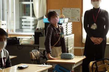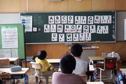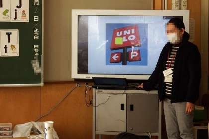 写真は、外国語の学習の様子です。今日は、いろんな会社名に使われているアルファベットをクイズにして学習を進めました。普段自分たちが行くお店が登場します。楽しみながらアルファベットの学習を行うことができました。