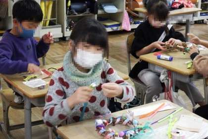 あさがおのつるなどをもとに作成したリースの飾りつけを行いました。ベルやリボンなどクリスマスに合わせたかわいい飾りつけができました。自分のリースを「見てみて」と見せてくれる子もたくさん。