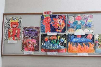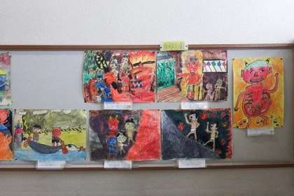 感想画「じごくのそうべい」の作品が完成しました。学年掲示板に展示してある作品を紹介します。写真は、3年1組と2組の作品です。