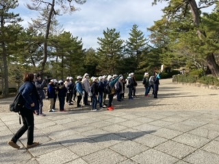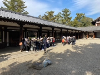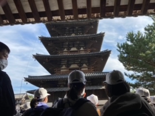 法隆寺でガイドさんの説明を聞き、五重の塔を見上げます。
