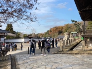 班別行動で奈良公園内を散策。途中たくさんの鹿と遭遇しながら、二月堂や三月堂を巡ります。