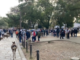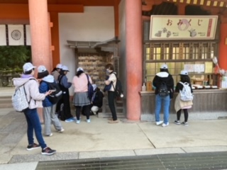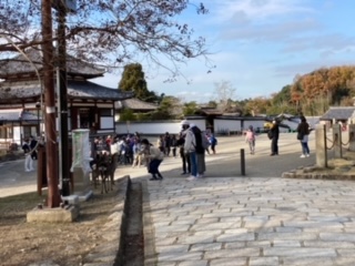 班別行動では、春日大社まで足を伸ばす班も。南大門の前で集合し、次は、平等院に向かいます。