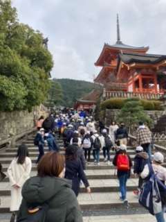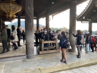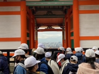 清水寺を学級ごとに見学します。眼下には、京都の街並みが広がっています。