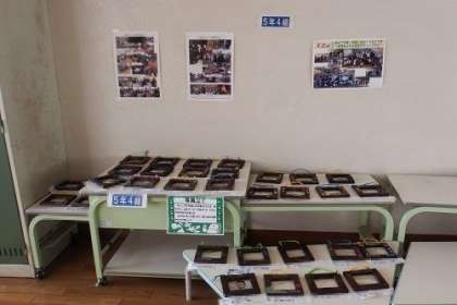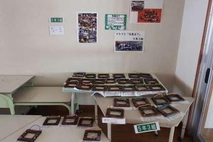 5年生がキャンプで作った写真立てをわたりに展示しています。懇談会の際に見ていただけた方もおられるでしょう。楽しかったキャンプを思い出します。写真は、5年3組と4組です。